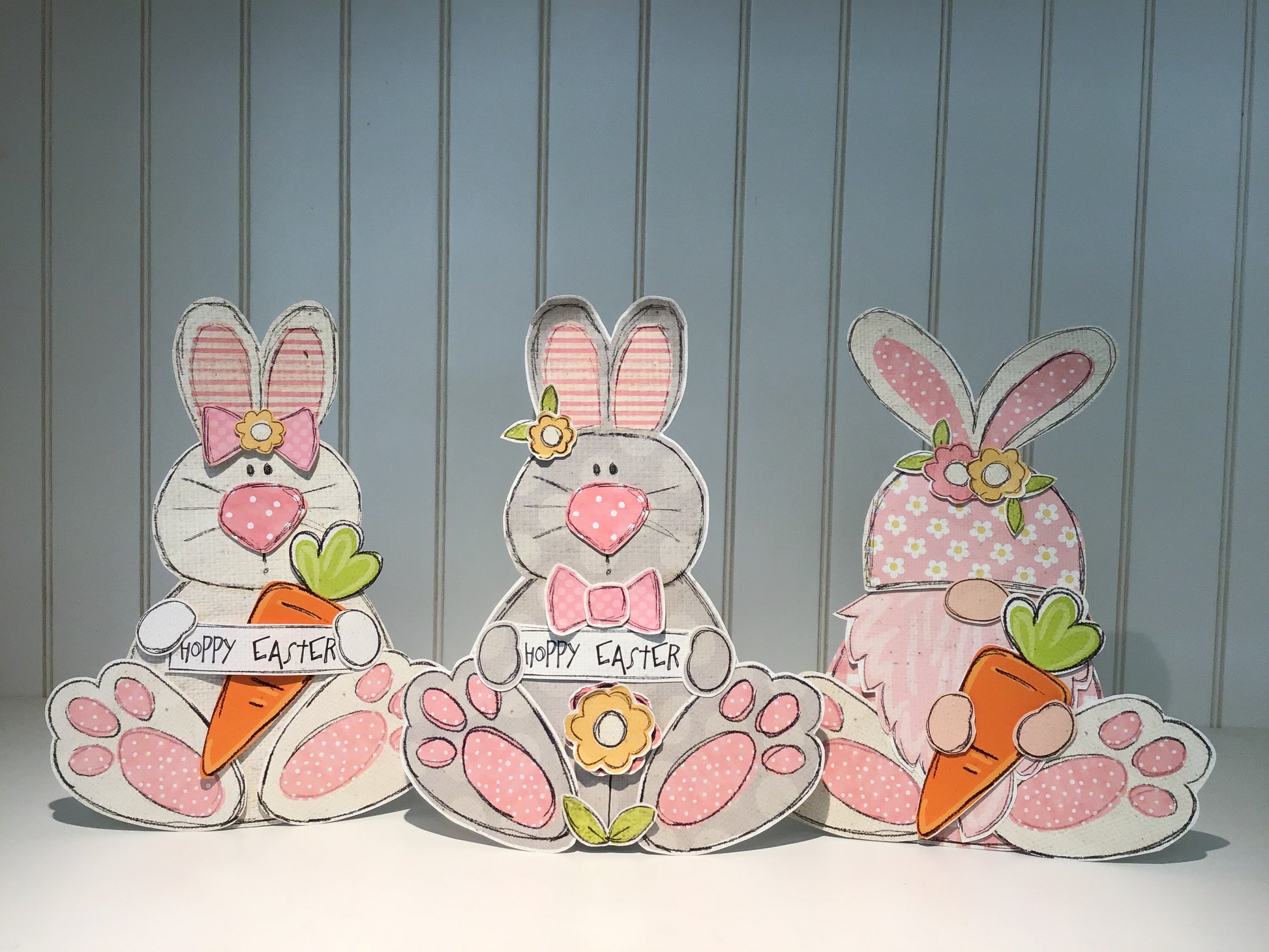 All 3 "Bunnies" in one purchase! Cut the the pieces out, and attach for a fun and quick shelf decoration. Gnome is printed on a heavier card stock, double sided for a finished back, includes a stand. When finished, It will be about 9 inches tall and 8 1/2 inches wide. Hippity Hoppity!!